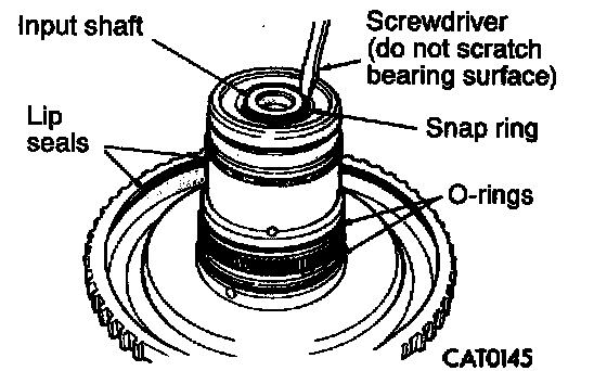 Snap ring ends must be located within one finger of the input clutch retainer. Be sure that snap ring is fully seated, by pushing with screwdriver, into snap ring groove all the way around.