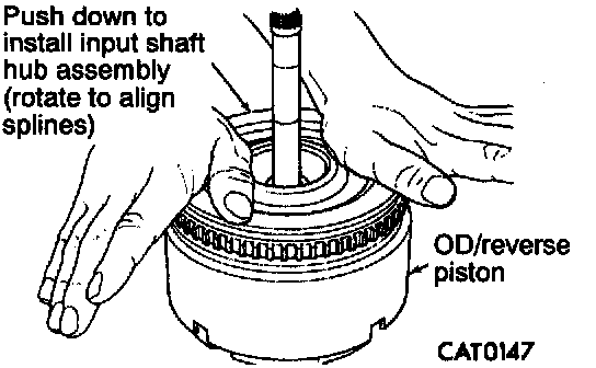 6. To install input shaft hub assembly to overdrive/reverse piston, rotate input shaft hub to align splines with overdrive/reverse piston and push down by hand.