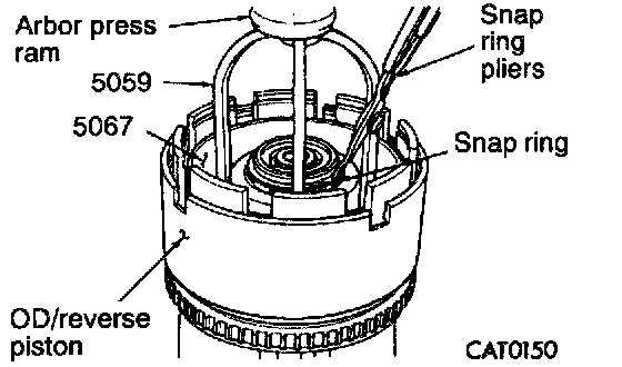 22. While pressure down overdrive/reverse pressure plate with Spring Compressor 5059 and arbor press ram, install flat snap ring.