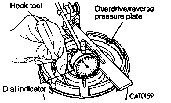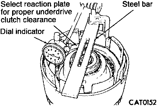 18. Use hook tool to raise top clutch disc. Read dial indicator. Underdrive clutch pack clearance must be 0.91 to 1.47 mm (0.0358 to 0.0579 inch). Select the proper reaction plate to achieve specifications: