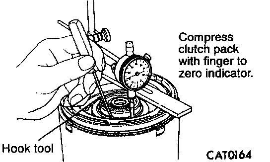 17. Set up dial indicator and steel bar as shown for checking clutch clearance. Compress clutch pack with finger to zero dial indicator.