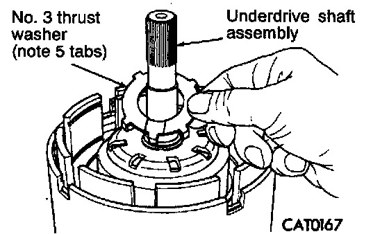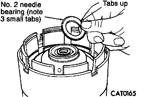 29. After removing reverse and overdrive clutches, install No. 2 needle bearing with 3 small tabs facing up.