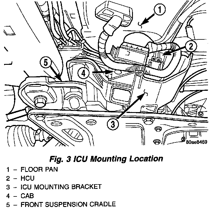 The Hydraulic Control Unit (HCU) and the Controller Antilock Brake (CAB) used with this antilock brake system are combined (integrated) into one unit, which is called the Integrated Control Unit (ICU). The ICU is located on the driver's side of the front suspension cradle under the vehicl.