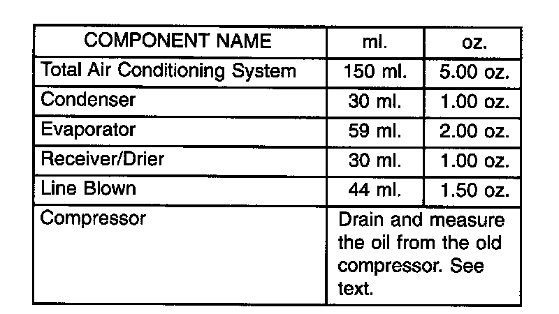 When an air conditioning system is first assembled, all components (except the compressor) are refrigerant oil free. After the system has been charged with (R-134a) refrigerant and operated, the oil in the compressor is dispersed through the lines and components. The evaporator, condenser, and receiver/drier will retain a significant amount of oil. Refer to the A/C Component Refrigerant Oil Capacities table. When a component is replaced, the specified amount of refrigerant oil must be added. When the compressor is replaced, the amount of oil that is retained in the rest of the system must be drained from the replacement compressor. The oil capacity of the system, minus the amount of oil still in the remaining components (refer to the oil capacity chart) can be measured and poured into the suction port of the compressor. When a line or component has ruptured and oil has escaped, the receiver/drier must be replaced along with the ruptured part.