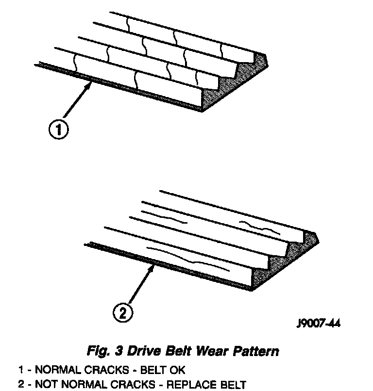 Poly-V Belt system may develop minor cracks across the ribbed side (due to reverse bending). These minor cracks are considered normal and acceptable. Parallel cracks are not (Fig. 3).