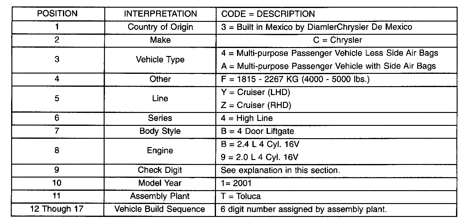 The Vehicle Identification Number (VIN) is located on the upper left corner of the instrument panel, near the left A-Pillar. The VIN consists of 17 characters in a combination of letters and numbers that provide specific information about the vehicle (Fig.1). Refer to VIN Code Decoding Chart.