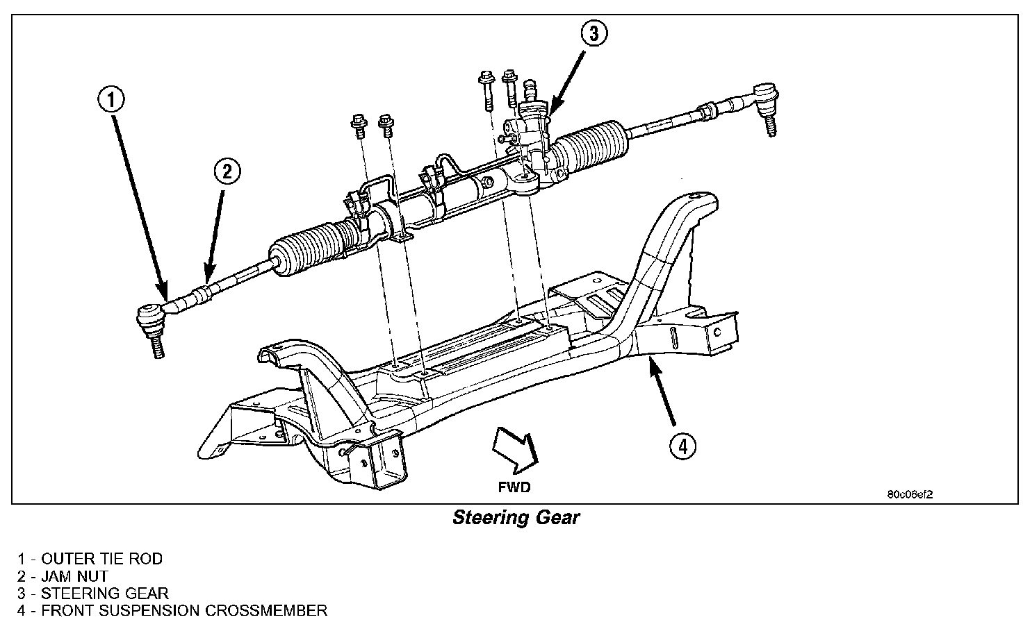 7. Attach the steering gear (3) to the front suspension crossmember (4). Install the four power steering gear mounting bolts. Tighten the mounting bolts to a torque of 61 N.m (45 ft. lbs.).