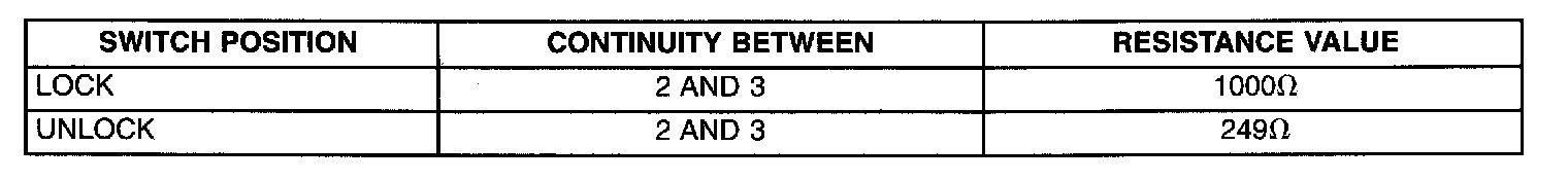 2. Using an ohmmeter, refer to Door Lock Switch Resistance table to determine if switch resistance is correct in the Lock and Unlock switch positions.