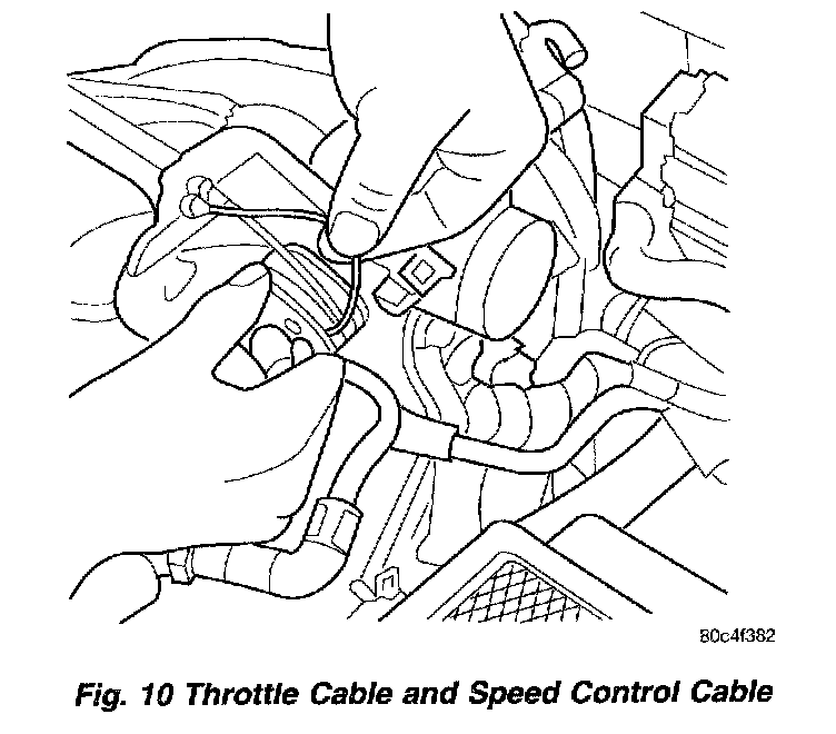 9. Remove speed control cable from throttle cam by sliding clasp out hole used for throttle cable.