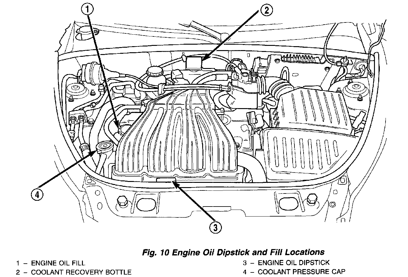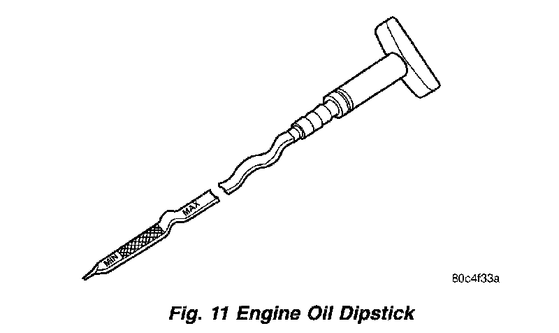 Checking the oil while the vehicle is on level ground will improve the accuracy of the oil level reading. Remove dipstick (Fig. 10), and observe oil level. Add oil only when the level is at or below the MIN mark (Fig. 11).