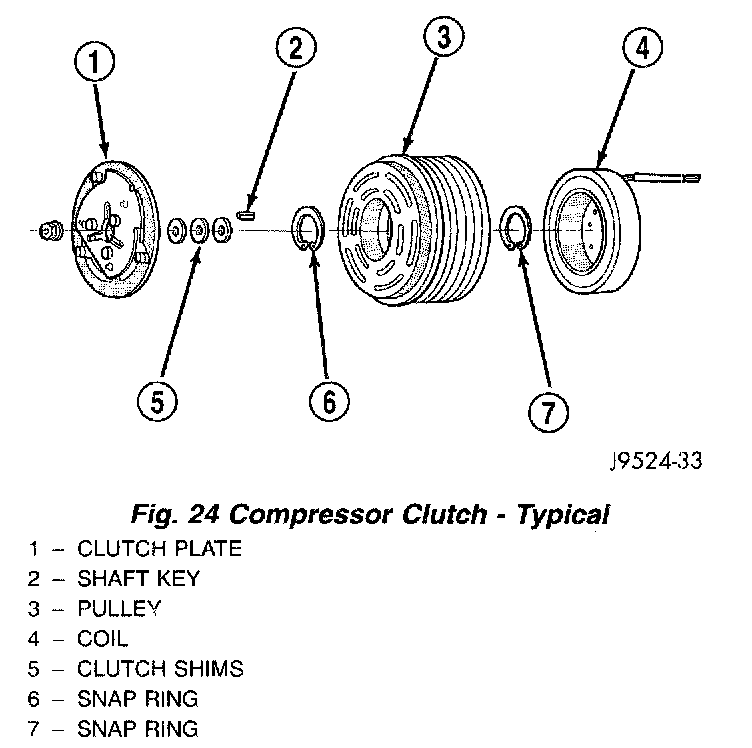 The compressor clutch assembly consists of a stationary electromagnetic coil with a zener diode, a hub bearing and pulley assembly, and a clutch plate. The electromagnetic coil unit and the hub bearing and pulley assembly are each retained on the nose of the compressor front housing with snap rings. The clutch plate is keyed to the compressor shaft and secured with a screw.