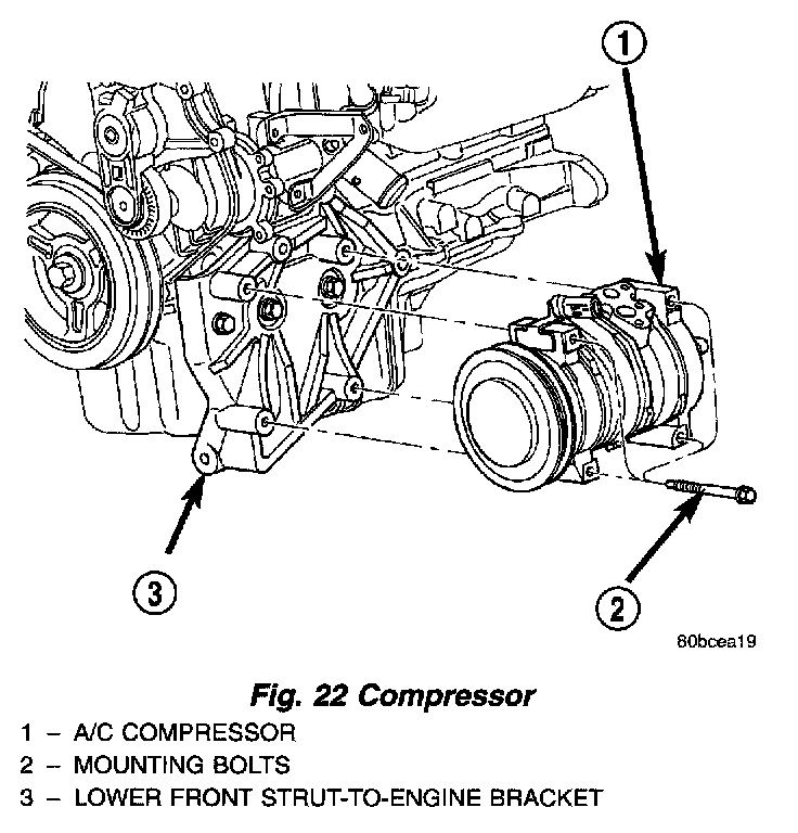 The compressor is secured to the lower front strut to-engine bracket with four screws. The lower front strut-to-engine bracket is located on the lower, forward skirt of the engine block which is located in the right front corner of the engine compartment.