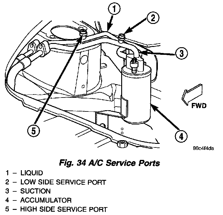 WARNING: REVIEW THE WARNINGS AND CAUTIONS BEFORE PERFORMING THE FOLLOWING OPERATION.Fig.34 A/C Service Ports: