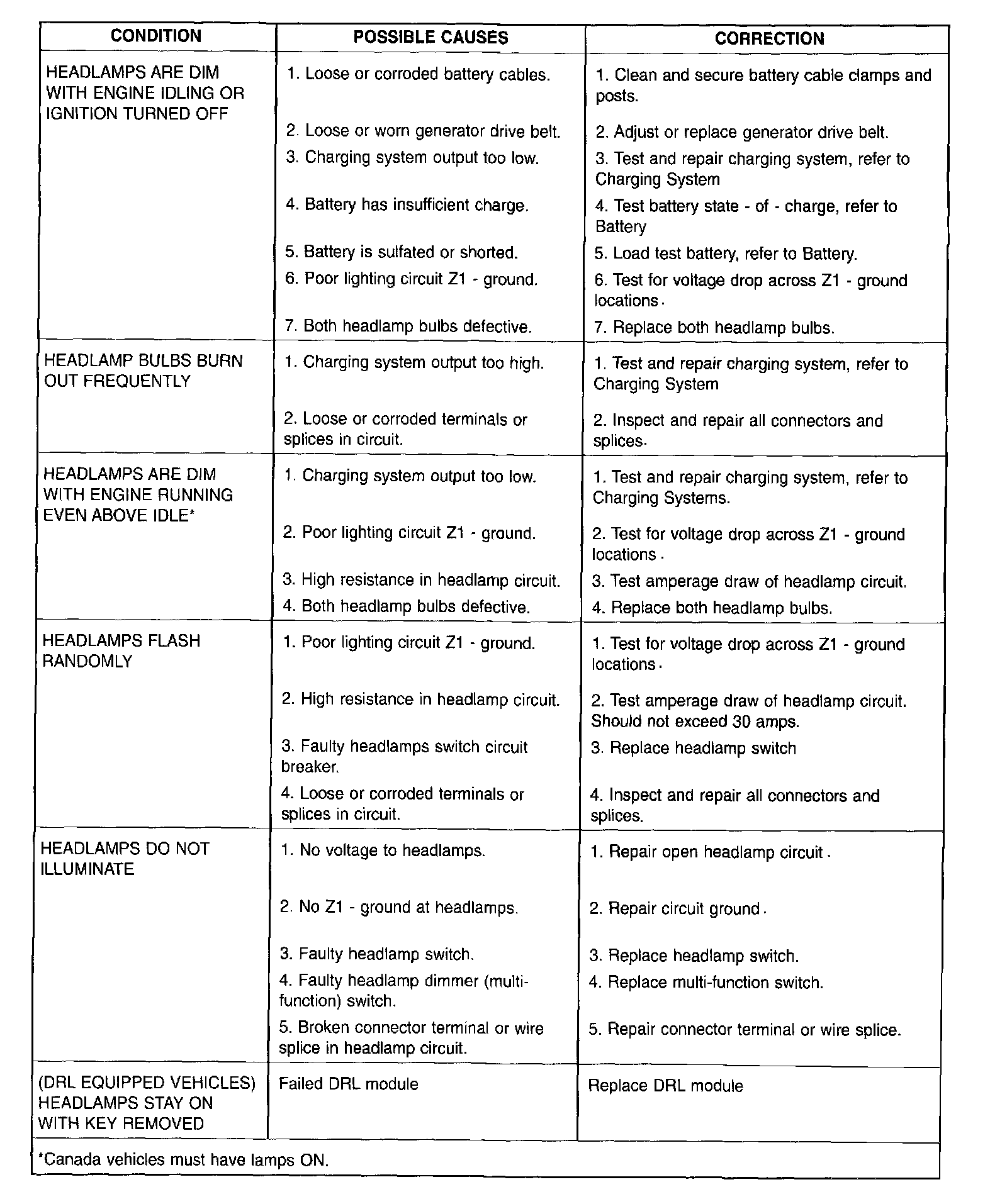 When a vehicle experiences problems with the headlamp system, verify the condition of the battery connections, fuses, charging system, headlamp bulbs, wire connectors, relay, high beam switch, dimmer switch, and headlamp switch.