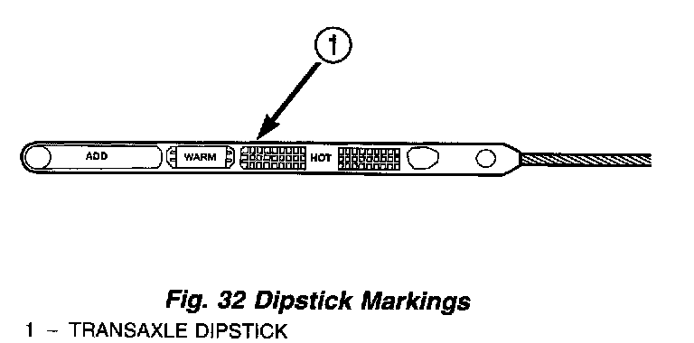 The torque converter fills in both the P Park and N Neutral positions. Place the selector lever in P Park to be sure that the fluid level check is accurate. The engine should be running at idle speed for at least one minute, with the vehicle on level ground. At normal operating temperature (approximately 82 C. or 180 F.), the fluid level is correct if it is in the HOT region (cross-hatched area) on the oil level indicator (Fig. 32). The fluid level should be within the WARM range of the dipstick at 70° F fluid temperature.