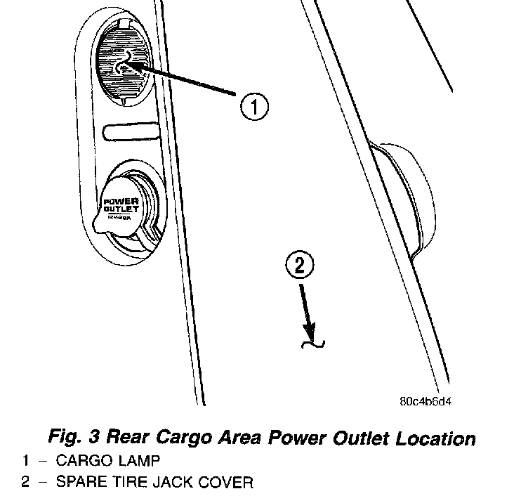 A front console mounted power outlet is standard equipment and a rear cargo area power outlet is optional equipment on this model. The front console mounted power outlet is mounted near the front of the console just in front of the cup holders (Fig. 2).A This outlet can be used as a cigar lighter or power outlet, but only has 12 volt battery voltage when the ignition is in the ON or ACC positions. The rear power outlet is installed in the right rear quarter trim panel, near the spare tire jack (Fig. 3). The power outlet base and mount are secured by a snap fit within the quarter trim panel. A plastic protective cap snaps into the power outlet base when the power outlet is not being used, and hangs from the power outlet base mount by an integral bail strap while the power outlet is in use. While the power outlet is very similar to a cigar lighter base unit, it does not include the two small spring-clip retainers inside the bottom of the receptacle shell that are used to secure the cigar lighter heating element to the insulated contact. It has 12 volt battery voltage when the ignition is in the ON or ACC positions.
