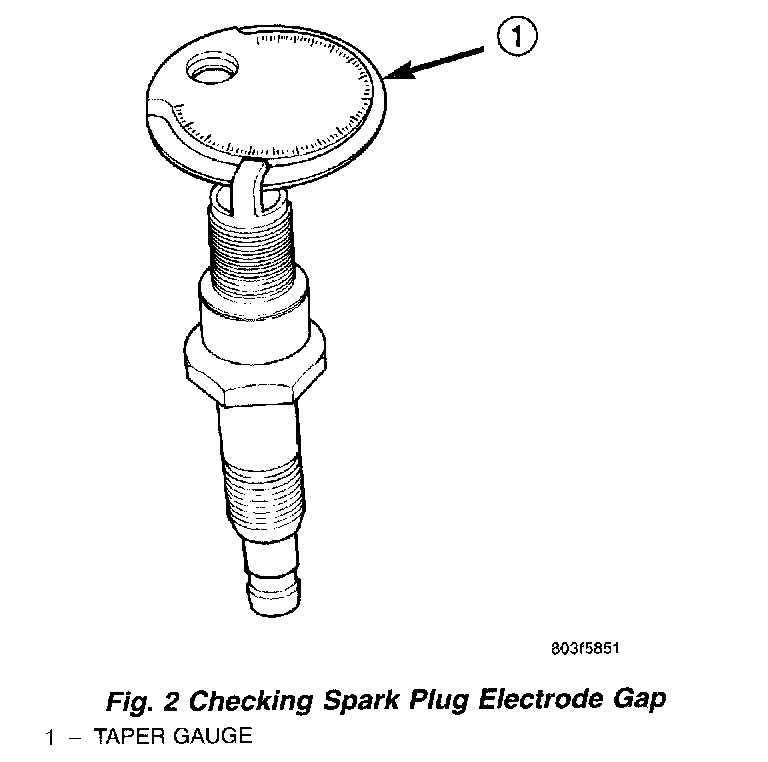 The engine uses resistor type spark plugs. Remove the spark plugs and examine them for burned electrodes and fouled, cracked or broken porcelain insulators. Keep plugs arranged in the order in which they were removed from the engine. An isolated plug displaying an abnormal condition indicates that a problem exists in the corresponding cylinder.Fig.2 Checking Spark Plug Electrode Gap: