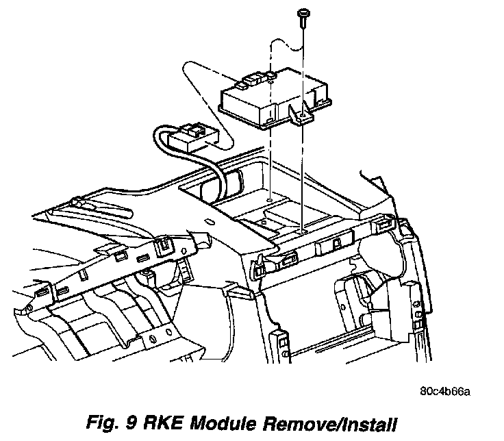 NOTE: When replacing a faulty RKE Module, the replacement module must be configured with the DRB III(R) scan tool for proper operation. Refer to Vehicle Theft/Security Systems, Switching Operating Modes/Configuring a New Module under Service Procedures. Additionally, all transmitters must be reprogrammed to the new RKE module.