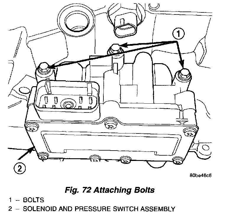 8. Remove the three solenoid/pressure switch assembly-to-transaxle case bolts (Fig. 72).