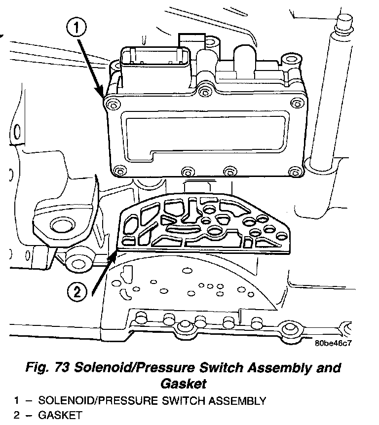 1. Install solenoid/pressure switch assembly to case using a new gasket (Fig. 73).