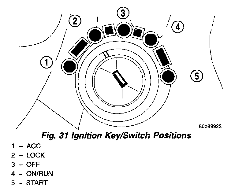 Refer to the chart that expected shifter response, depending on ignition key/switch (Fig. 31) and brake pedal positions.