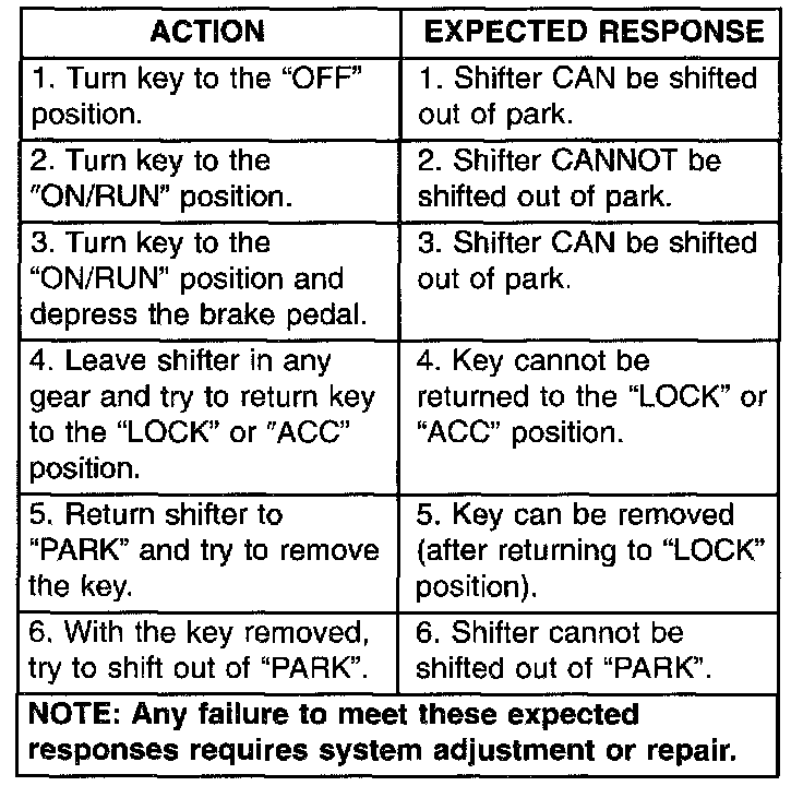 BRAKE/TRANSMISSION SHIFT INTERLOCK SYSTEMThe following chart describes the normal operation of the Brake Transmission Shift Interlock (BTSI) system. If the "expected response" differs from the vehicle's response, then system repair and/or adjustment is necessary.