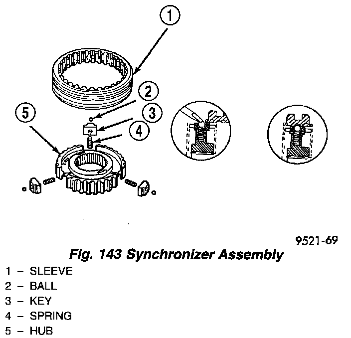 Place synchronizer in a clean shop towel and wrap. Press on inner hub. Carefully open up shop towel and remove springs, balls, keys, hub, and sleeve.