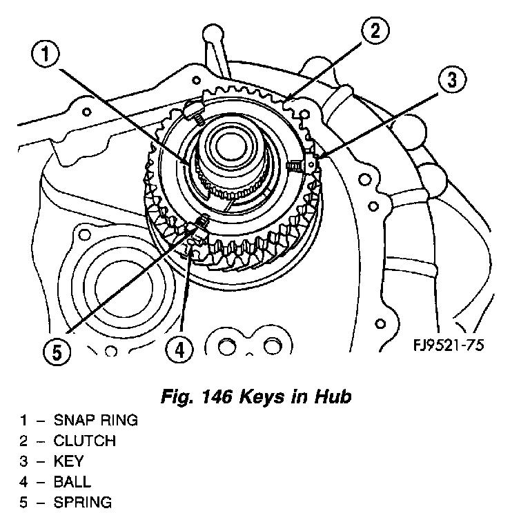 6. Line up stop ring tang over the keys in the hub (Fig. 146). Install stop rings. Center the keys and balls by pushing on both stop rings.