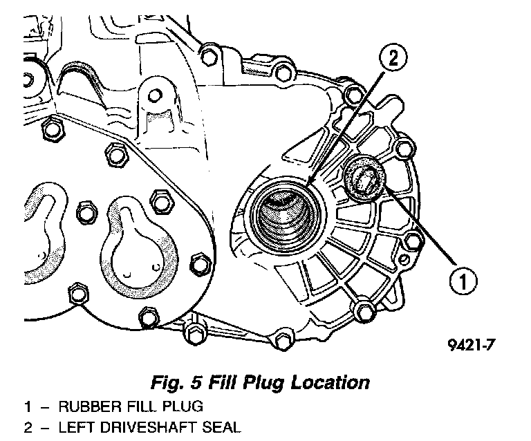 FLUID DRAIN AND FILLAll NV T350 (A-578) transaxles are equipped with a fill plug. The fill plug is located on the left side of the transaxle differential area (Fig. 5). The fluid level should be within 3/16 inch from the bottom of the transaxle fill hole (vehicle must be level when checking).