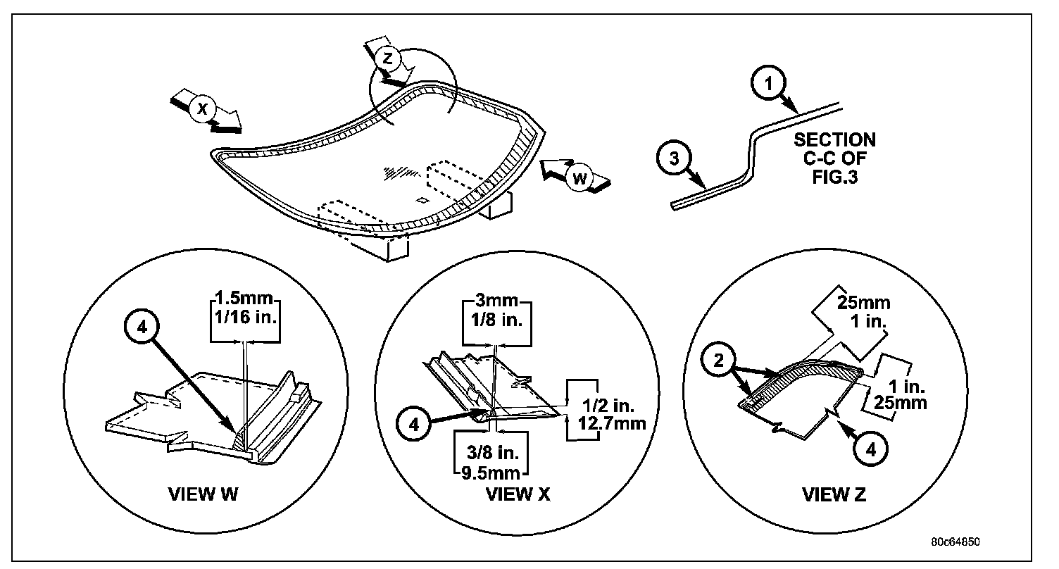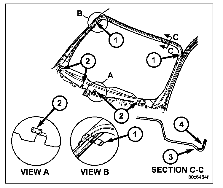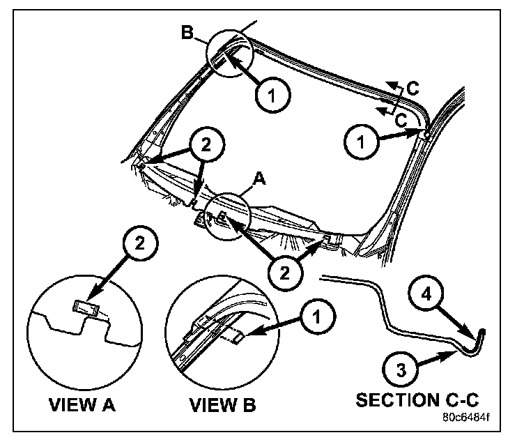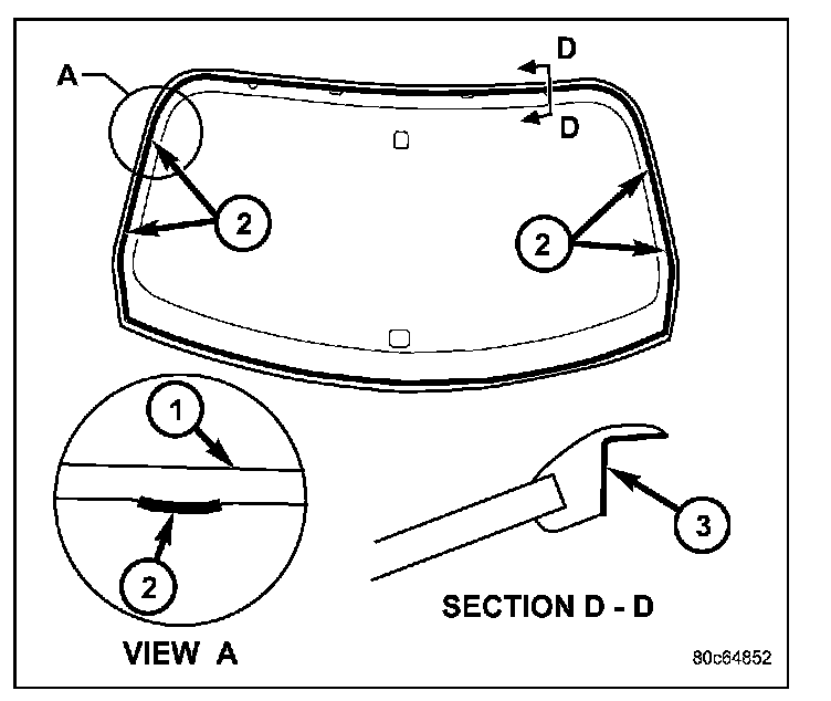 11. Apply a bead of urethane (4) on windshield glass as indicated.