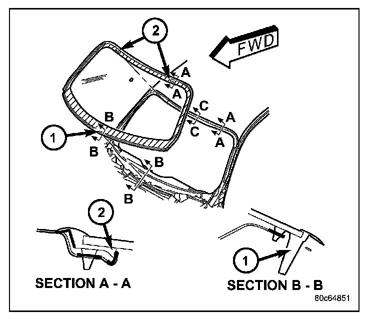 CAUTION: Open the left front door glass before installing windshield to avoid pressurizing the passenger compartment. If a door is slammed before urethane bonding is cured, water leaks can result. Allow the urethane at least 24 hours to cure before returning the vehicle to use. To avoid stressing the replacement windshield, the urethane bonding material on the windshield fence should be smooth and consistent to the shape of the replacement windshield. The support spacers should be cleaned and properly installed on weld studs or repair screws at bottom of windshield opening.