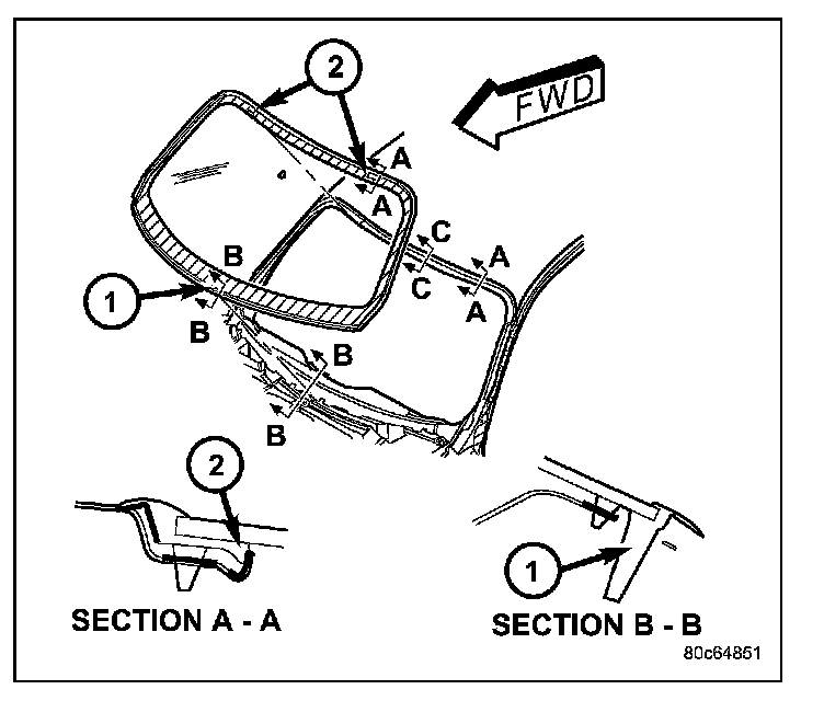 8. Apply Glass Primer 25 mm (1 inch) (2) wide around perimeter of windshield. Allow at least three minutes drying time.