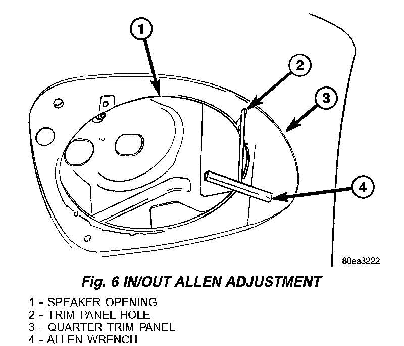 3. Using a suitable allen wrench (Fig. 6), rotate the jack-screw to achieve the proper gap between the door glass and the quarter glass seal (Fig. 4). Tighten all fasteners prior to measuring the gaps.