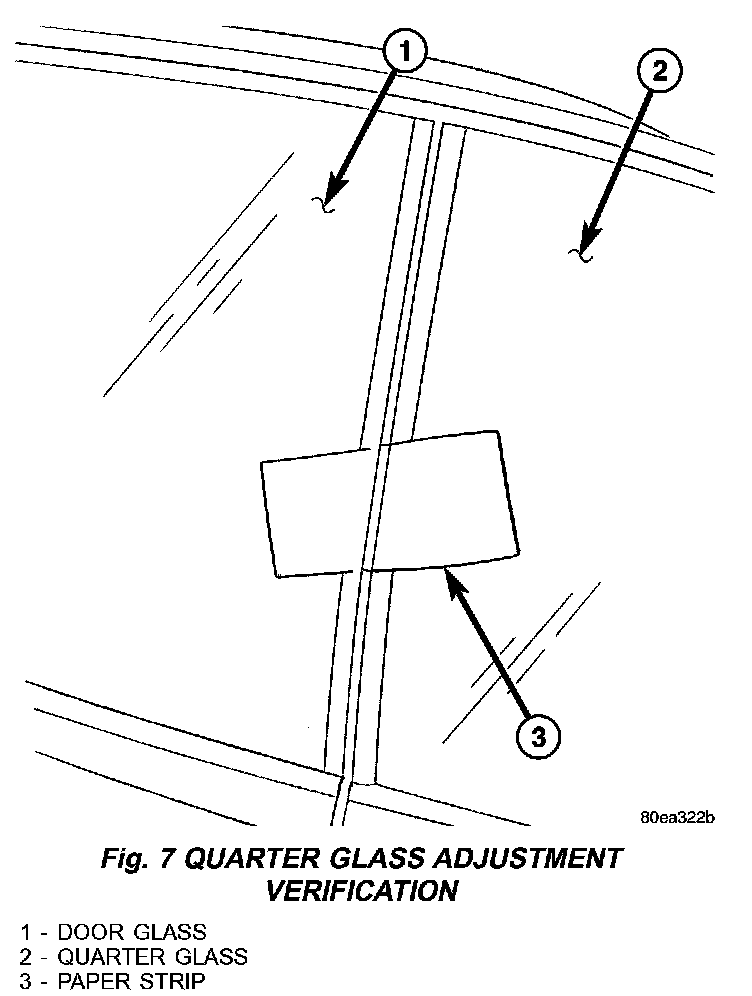 NOTE: The alignment to door glass can be checked with the "paper strip test". Place a piece of paper on the quarter glass seal and close the door. Slide the paper along the length of the seal - there should be some resistance to pulling the paper out. (Fig. 7).