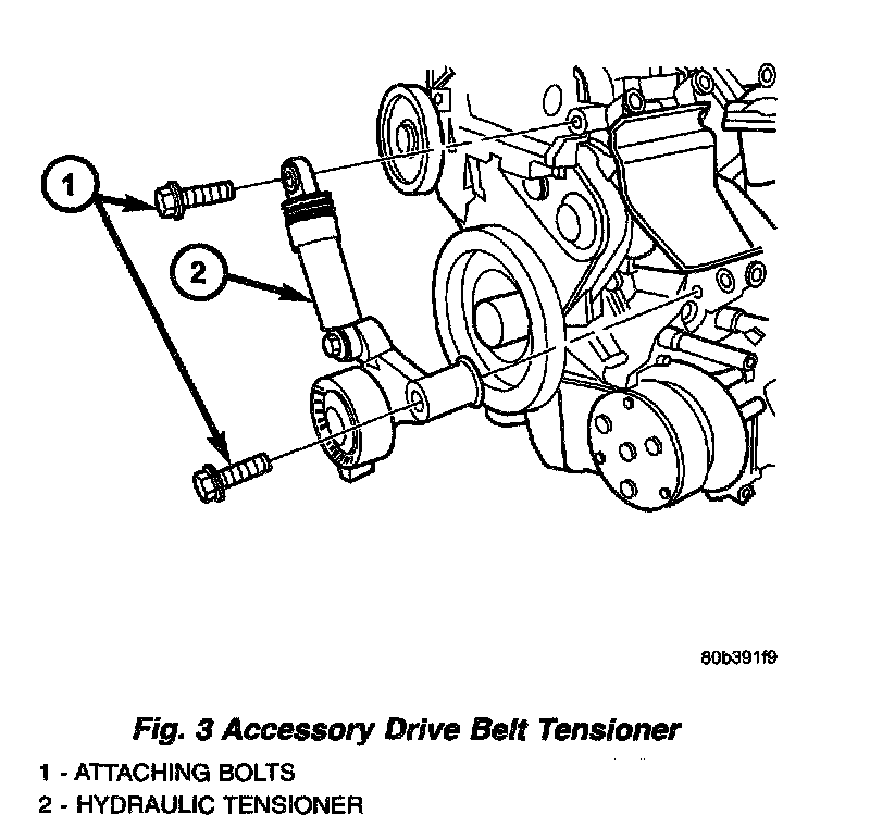 3. Rotate belt tensioner clockwise until belt can be removed from pulleys (Fig. 3). Remove belt.