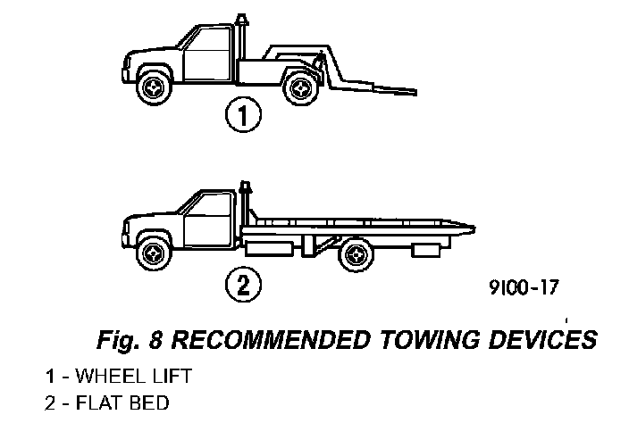 To avoid damage to bumper fascia and air dams use of a wheel lift or flat bed towing device (Fig. 8) is recommended. When using a wheel lift towing device, be sure the rear end of disabled vehicle has at least 100 mm (4 inches) ground clearance. If minimum ground clearance cannot be reached, use a towing dolly. If a flat bed device is used, the approach angle should not exceed