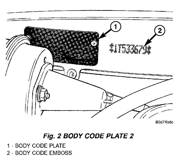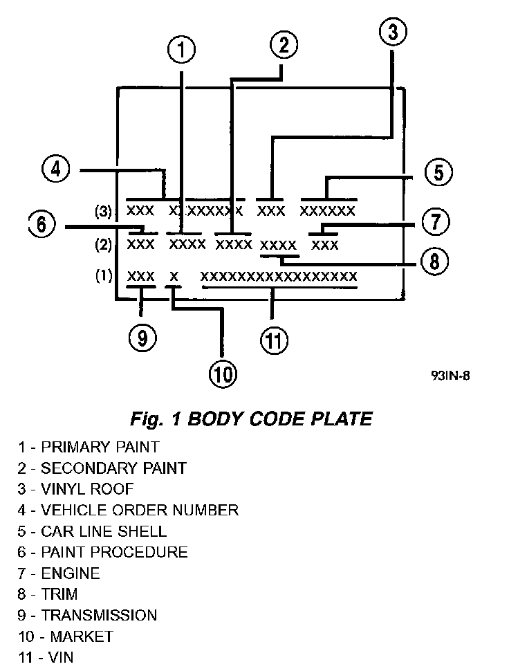 The Body Code Plate (Fig. 1) is located in the engine compartment on the plenum behind the right side strut tower (Fig. 2). There are seven lines of information on the body code plate. Lines 4, 5, 6, and 7 are not used to define service information. Information reads from left to right, starting with line 3 in the center of the plate to line 1 at the bottom of the plate.