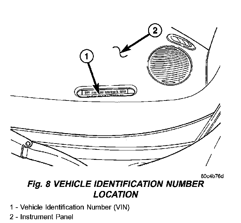 The Vehicle Identification Number (VIN) is located on the upper left corner of the instrument panel, near the left A-Pillar. The VIN consists of 17 characters in a combination of letters and numbers that provide specific information about the vehicle (Fig.8). Refer to VIN Code Decoding Chart.