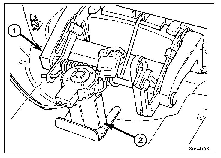 3. Disengage the retainer clip that secures the lock cylinder (2) to the liftgate (1) and remove the lock cylinder and gasket.