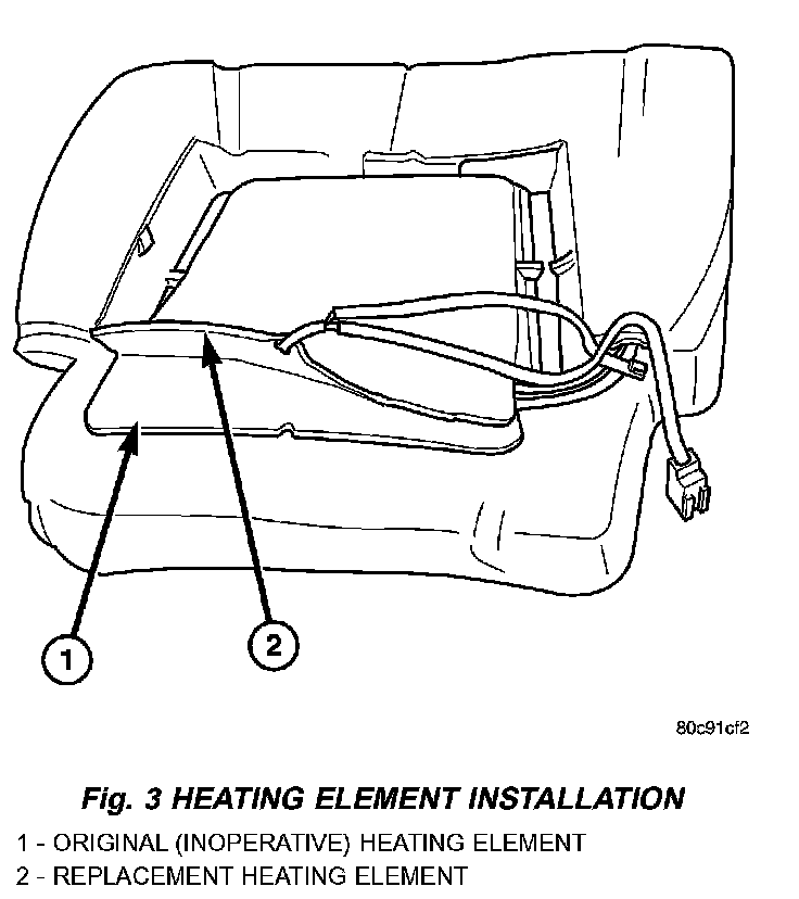 Do not attempt to remove the heating element from the seat or seat back cushion. The original element is permanently attached to the seat cushions and cannot be removed without damaging the cushion. The service replacement (if available) heating elements are designed to be applied directly over the original seat heating elements.