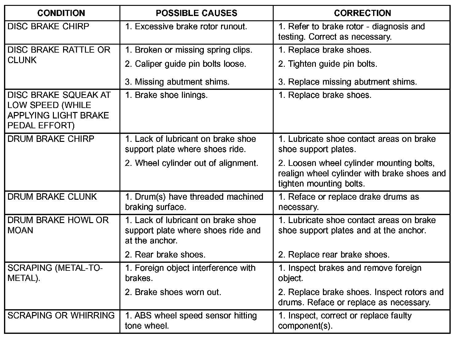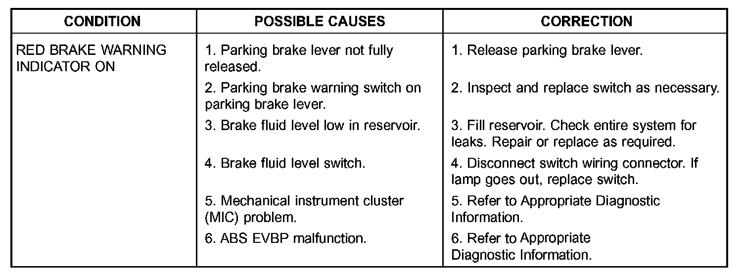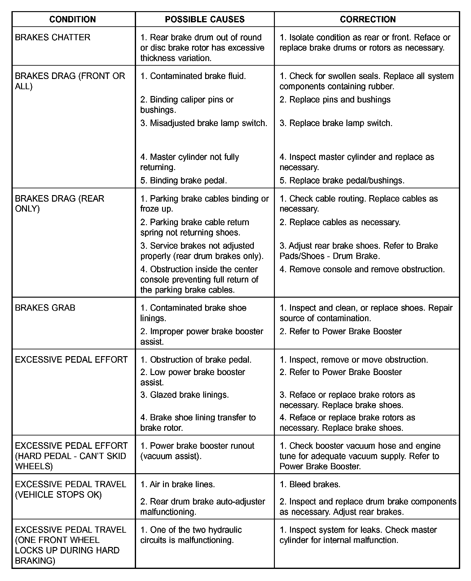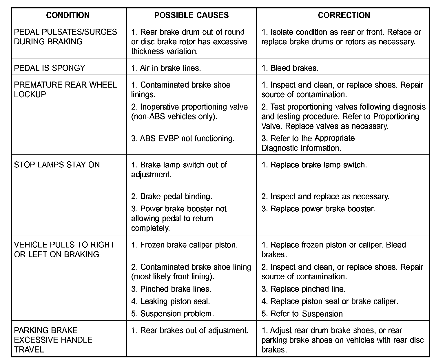 DIAGNOSIS AND TESTING - BASE BRAKE SYSTEM DIAGNOSIS CHARTSNOTE: There are three diagnosis charts following that cover the RED BRAKE WARNING INDICATOR, BRAKE NOISE and OTHER BRAKE CONDITIONS.