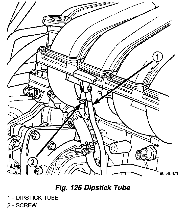 7. Install the screw attaching the oil dipstick tube to lower intake manifold (Fig. 126).