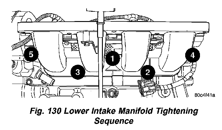 3. Install lower intake manifold. Tighten fasteners to 12 Nm (105 inch lbs.) in sequence shown in (Fig. 130).