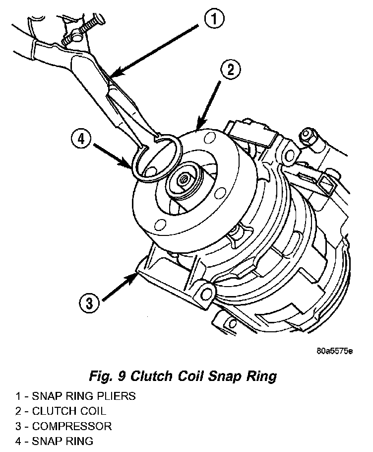 5. Remove snap ring retaining field coil onto compressor housing. Slide field coil off of compressor housing.