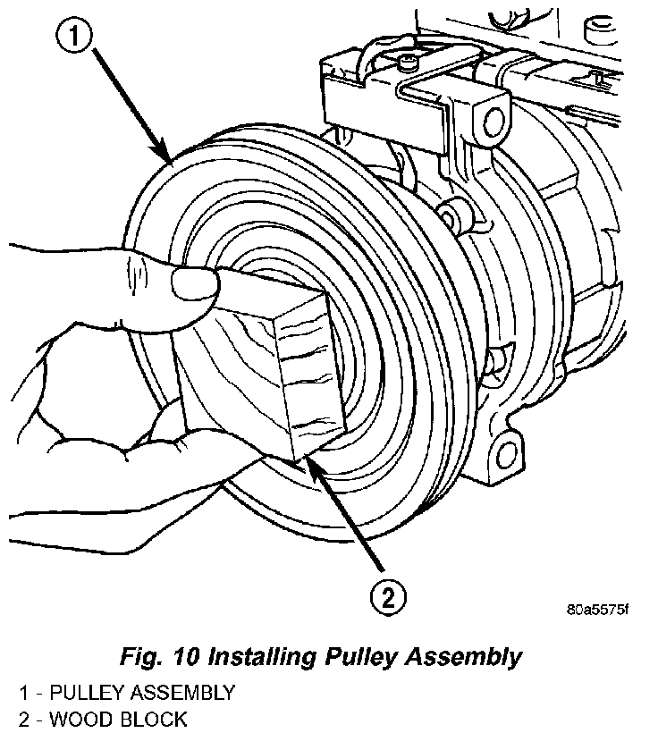 3. Install pulley assembly to compressor. If necessary, tap gently with a block of wood on the friction surface.