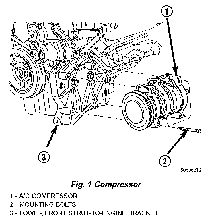 The compressor is secured to the lower front strut-to-engine bracket with four screws. The lower front strut-to-engine bracket is located on the lower, forward skirt of the engine block which is located in the right front corner of the engine compartment.