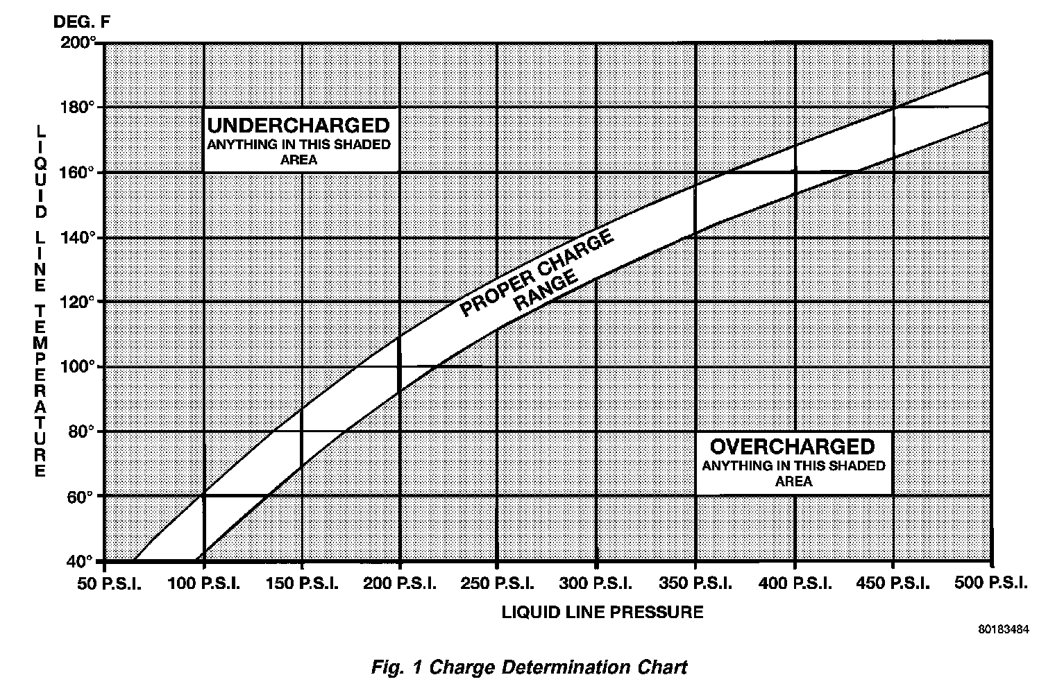 5. Observe filter/drier pressure and Liquid line temperature. Using the Charge Determination Chart determine where the system is currently operating. If the system is not in the proper range, reclaim all the refrigerant and recharge per A/C label.