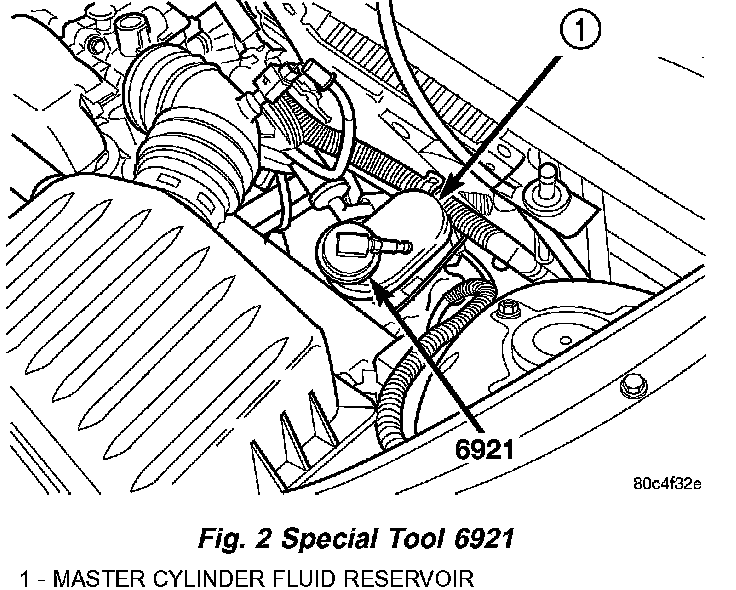 1. Attach Adapter, Special Tool 6921, to the master cylinder reservoir.
