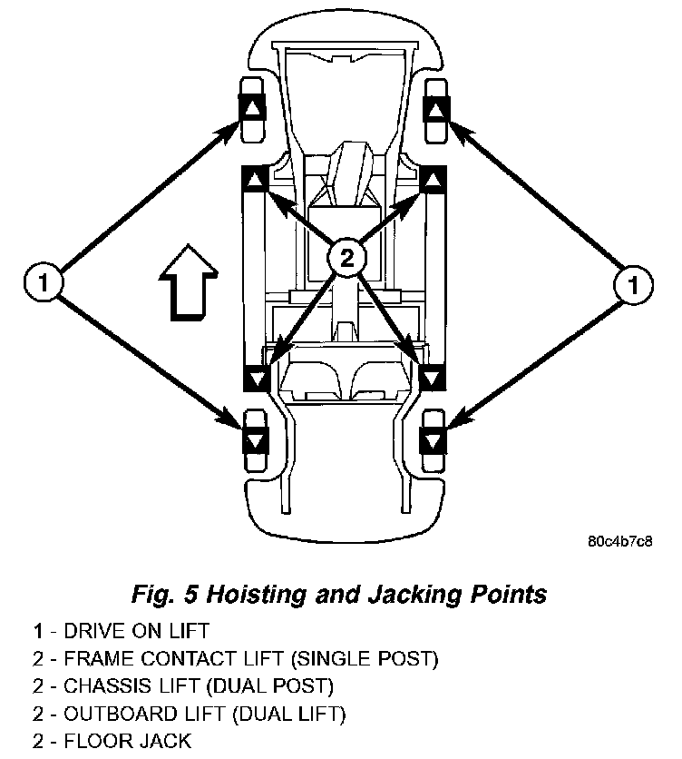 STANDARD PROCEDURE - HOISTINGRefer to Owner's Manual provided with vehicle for proper emergency jacking procedures.