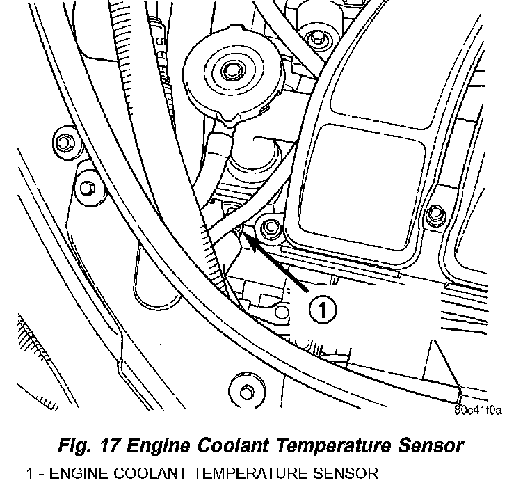 The Engine Coolant Temperature (ECT) sensor threads into the thermostat housing just below the coolant outlet connector. New sensors have sealant applied to the threads.